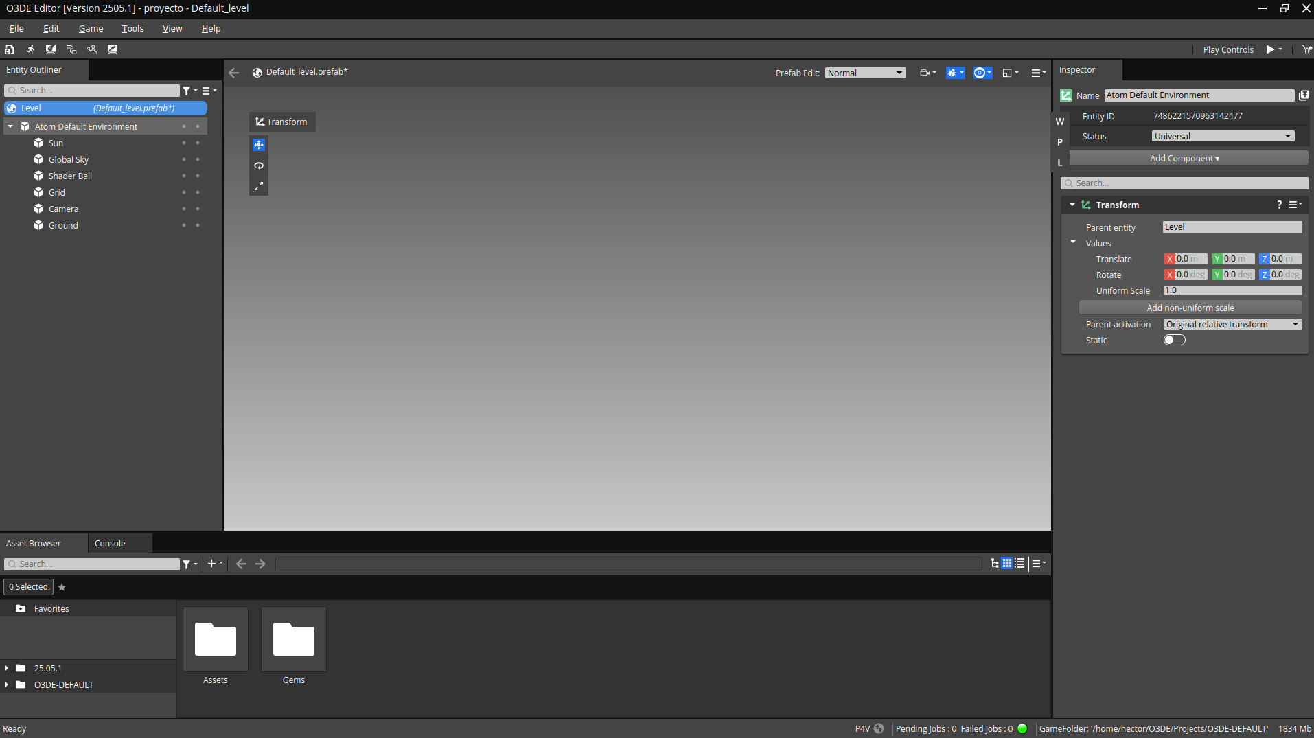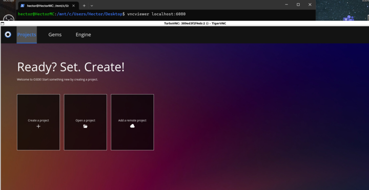Una vez ya iniciado el servidor con su puerto y display, solo quedaba exportar un display al servidor VNC, ejecutar O3DE y comprobar que cargaba la interfaz gráfica en el servidor VNC, mediante un cliente VNC como TigerVNC.